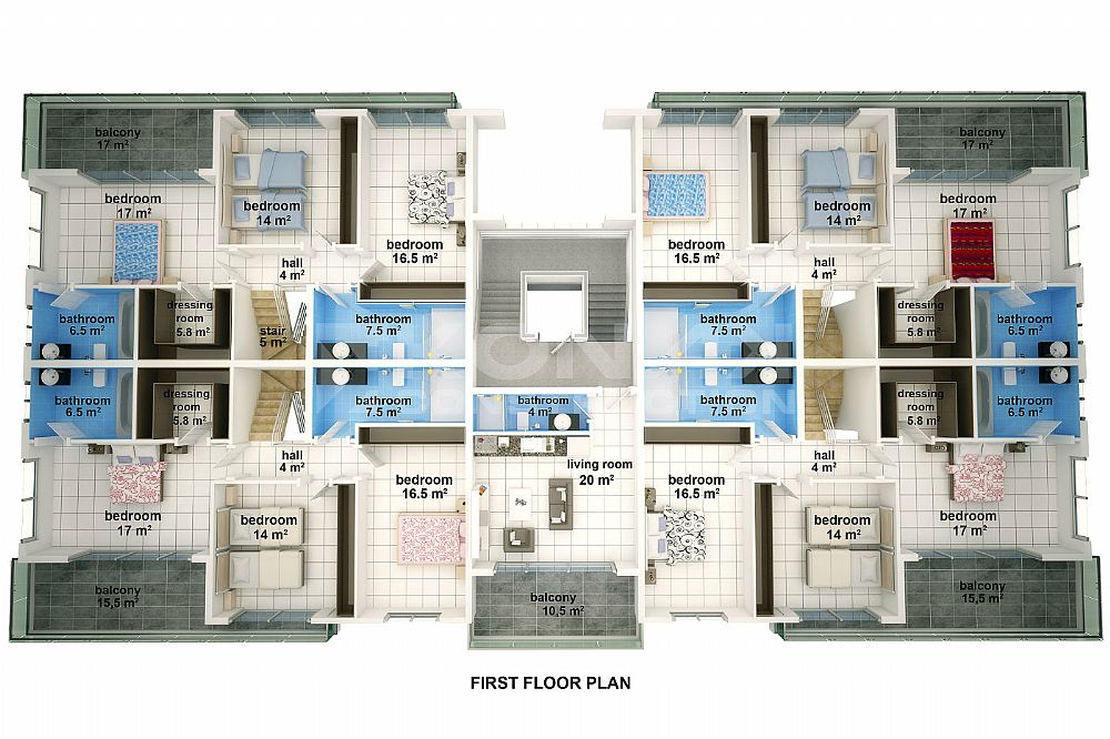 Габаритные размеры квартир являются: квартиры-студии 42 квадратных метров, 1 + 1 квартиры 76 квадратных метров, 2 + 1 квартиры 105 квадратных метров, 2 + 1 садовый дуплекс квартиры 175 квадратных метров, 3 + 1 садовый дуплекс квартиры 195 квадратных метров и 3 +1 пентхаус квартиры 170 и 230 квадратных метров.