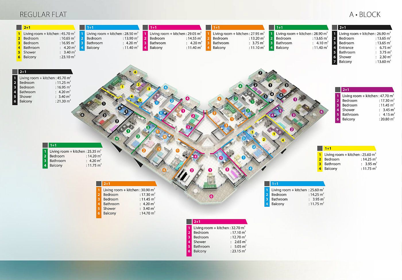 A BLOCK 63 Кв : ( 23 Кв 1+1 62-70м2 ) ( 16 Кв 2+1 91-118 м2 )