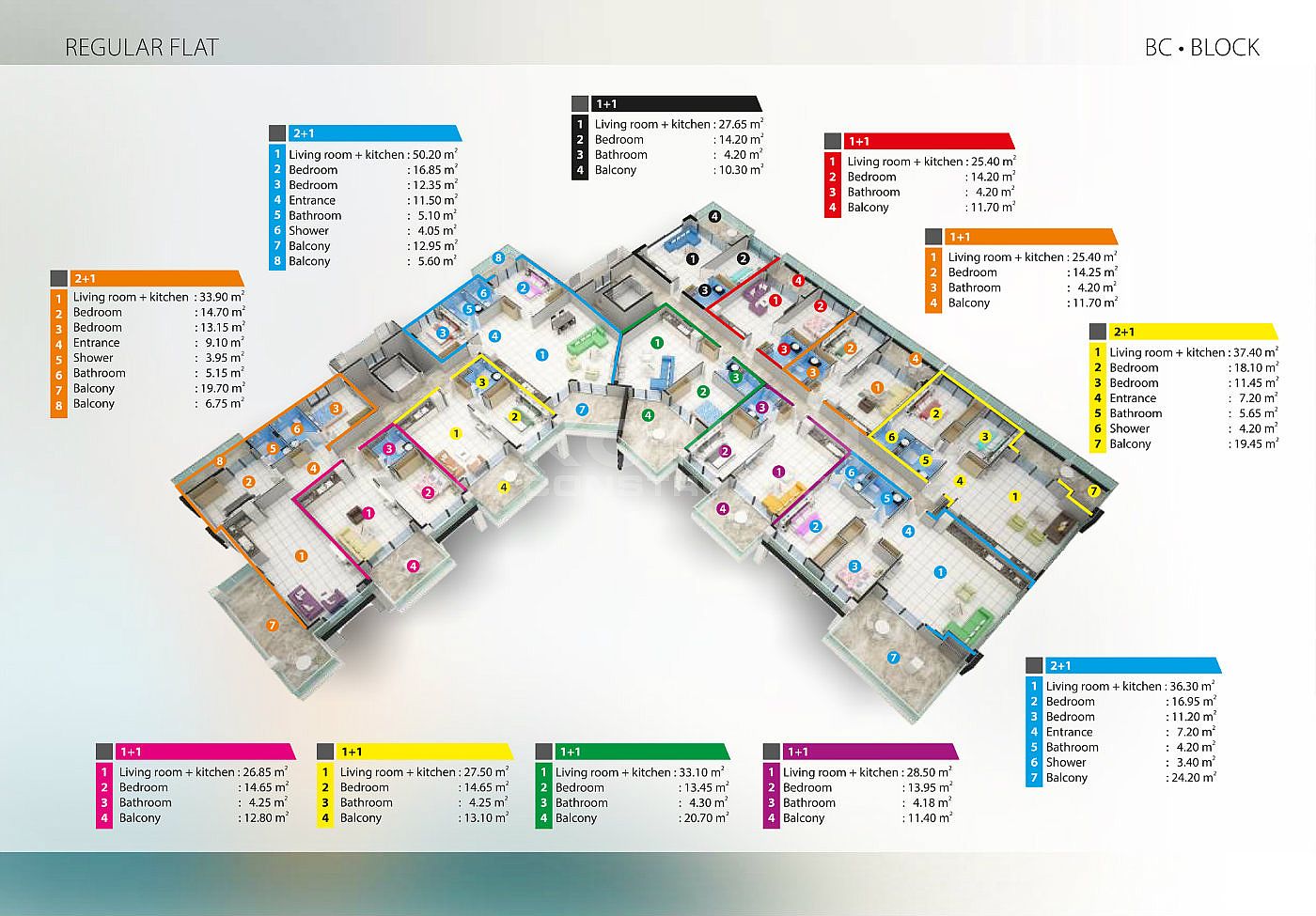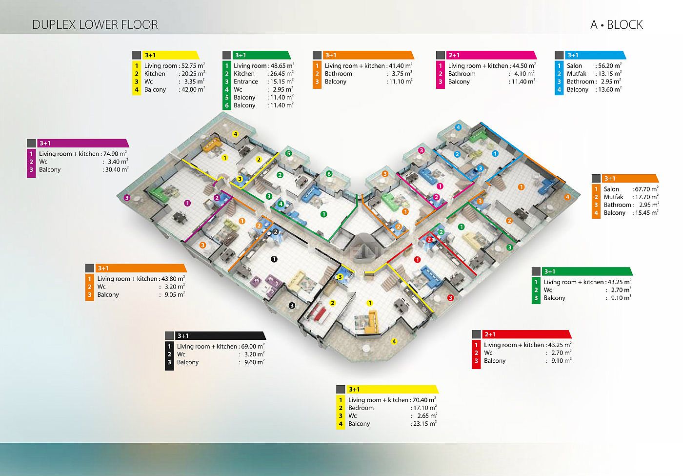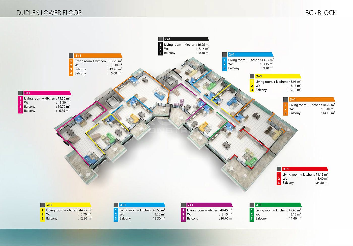 B-C BLOCK 55 Кв: ( 21 Кв 1+1 63-70м2 ) ( 12 Кв 2+1 118-132 м2 )